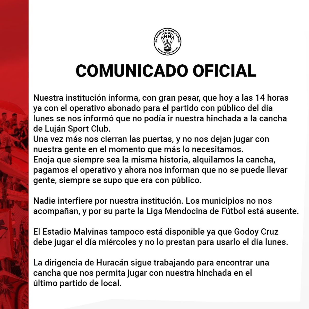 Huracán Las Heras emitió un comunicado manifestando su malestar porque no es la primera vez que en algún estadio no aceptan la presencia de sus simpatizantes.
