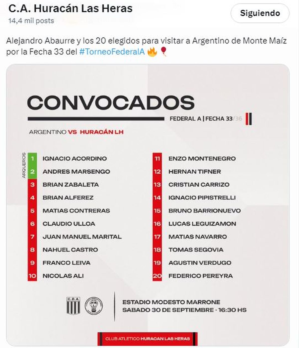 Huracán Las Heras se presentará este sábado desde las 16.30 en Córdoba ante Argentino de Monte Maíz, en el estadio Modesto Marrone de Córdoba, en el marco de la 33ra. fecha de la Zona 2 del Torneo Federal A.