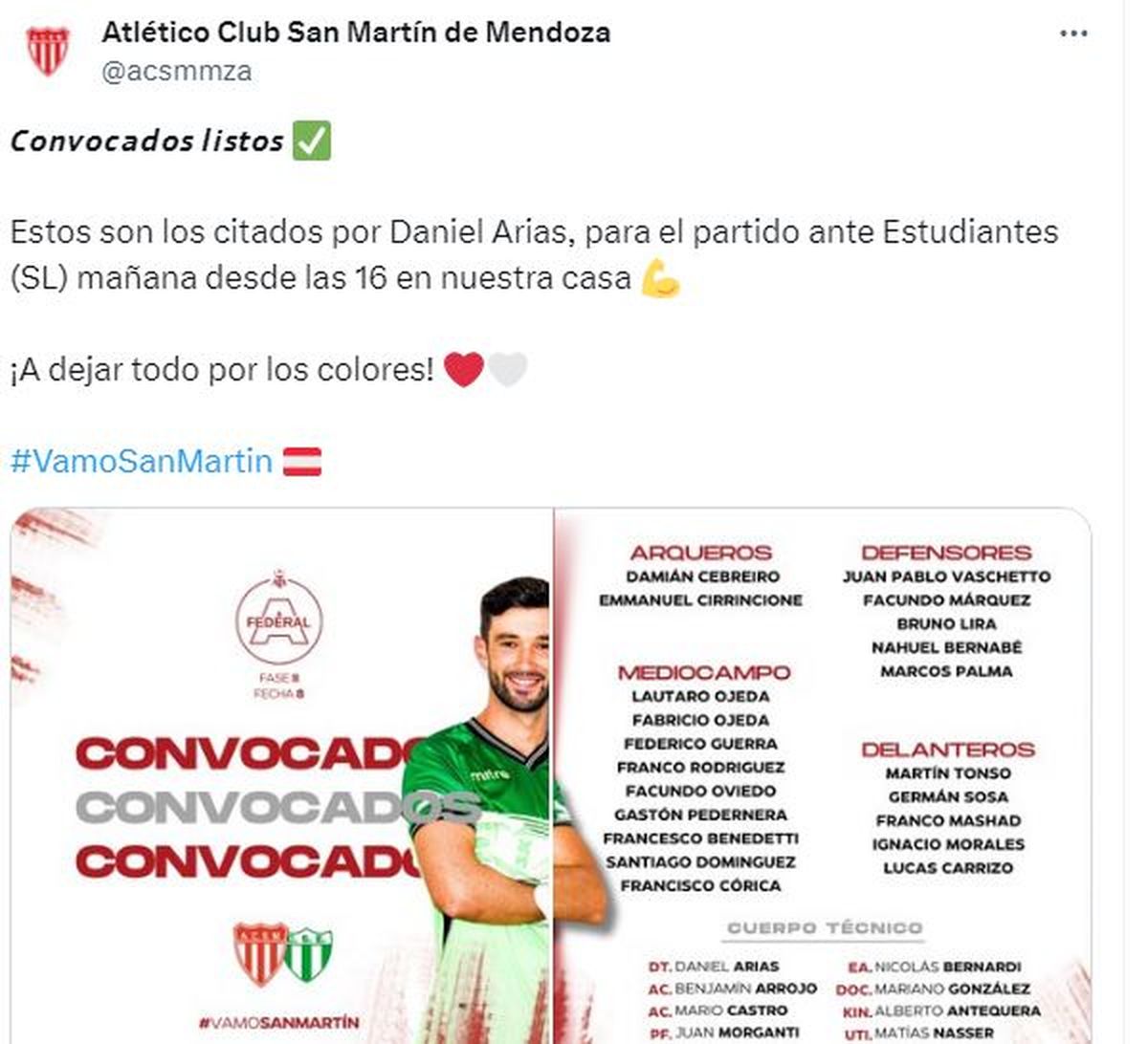 Atlético San Martín jugará de local desde las 16 ante Estudiantes de San Luis. El choque ante el Verde se disputará bajo el arbitraje de Marcos Ignacio Liuzzi, de la Liga de Ayacucho.
