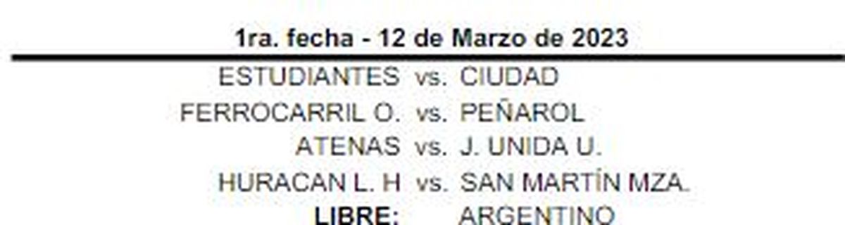 En la primera fecha se jugarán los partidos Estudiantes de San Luis-Ciudad de Bolívar; Ferro Carril Oeste de General Pico-Peñarol de San Juan; Atenas de Río Cuarto-Juventud Unida Universitario de San Luis y Huracán Las Heras-San Martín. Tendrá fecha libre en el estreno Argentino de Monte Maíz de Córdoba.