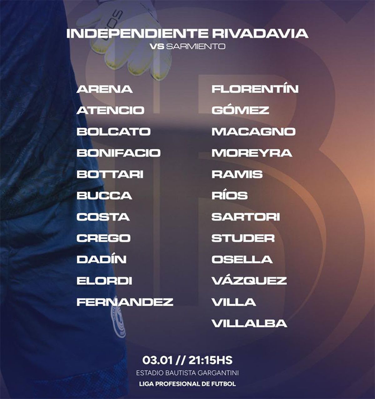 Independiente Rivadavia: Nicolás Bolcato; Alejo Osella, Iván Villalba, Leonard Costa, Sheyko Studer, Juan Manuel Elordi; Gonzalo Ríos o Sebastián Villa, Tomás Bottari, José Florentín; Matías Fernández y Fabrizio Sartori. DT: Alfredo Berti.