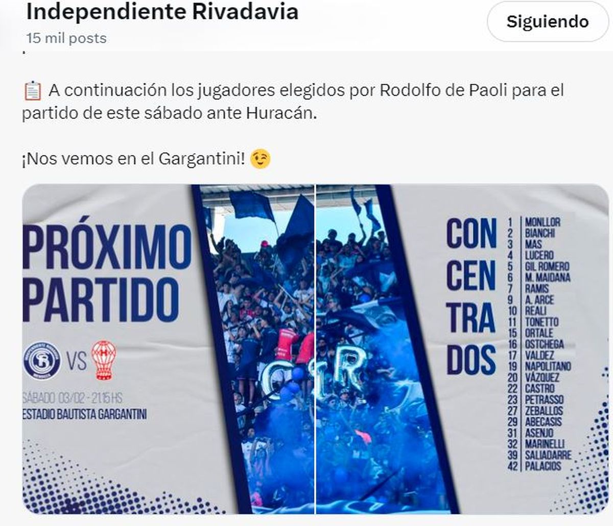 El entrenador de Independiente Rivadavia Rodolfo de Paoli le daría la confianza a los mismos jugadores que ganaron en la Plata y por segunda vez repetiría el equipo.