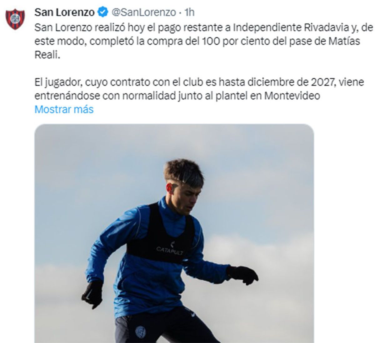 Mientras que el Cuervo dijo este lunes: "San Lorenzo realizó hoy el pago restante a Independiente Rivadavia y, de este modo, completó la compra del 100 por ciento del pase de Matías Reali. El jugador, cuyo contrato con el club es hasta diciembre de 2027, viene entrenándose con normalidad junto al plantel en Montevideo y se encuentra a disposición de Leandro Romagnoli para el amistoso de mañana contra Peñarol".