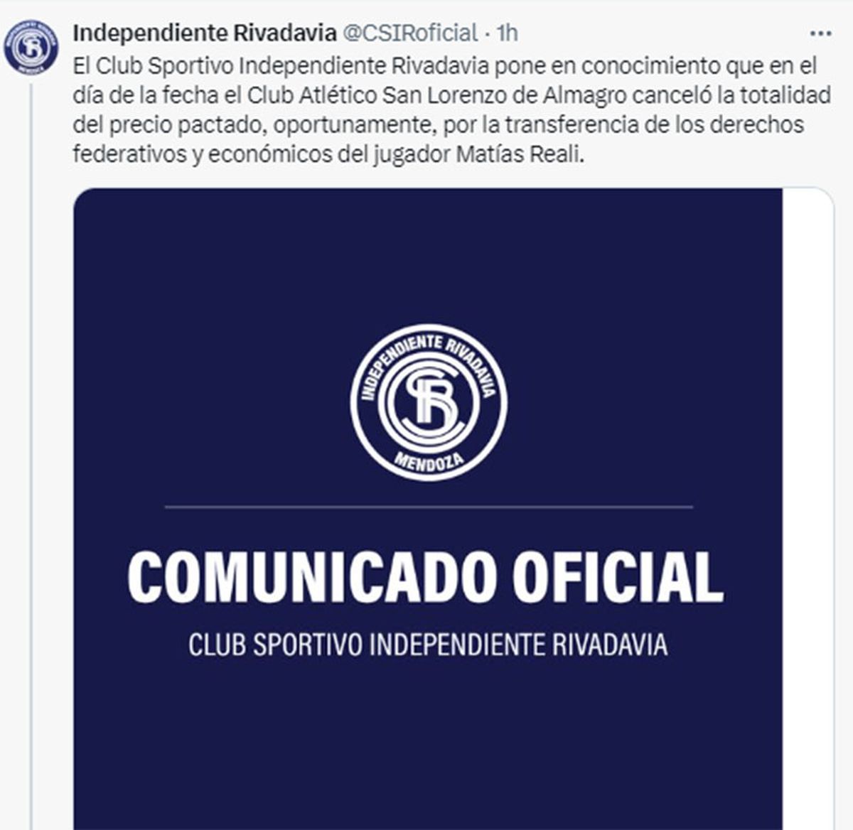 El equipo del Parque dijo este lunes: "El Club Sportivo Independiente Rivadavia pone en conocimiento que en el día de la fecha el Club Atlético San Lorenzo de Almagro canceló la totalidad del precio pactado, oportunamente, por la transferencia de los derechos federativos y económicos del jugador Matías Reali".