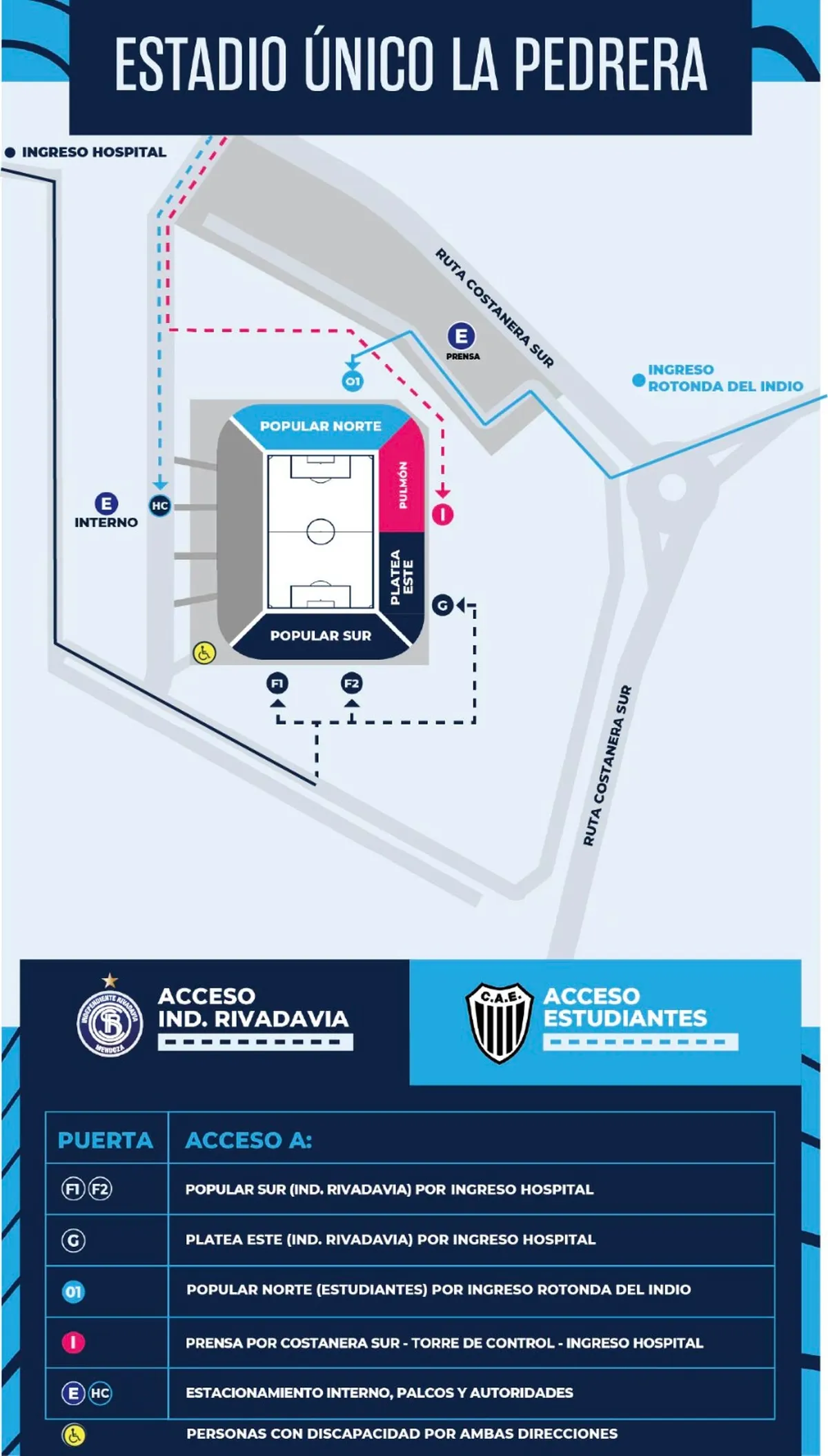 La hinchada de Independiente Rivadavia ocupará la Popular Sur y la Platea Este, ingresando por el Hospital y utilizando las puertas F1, F2 y G del Estadio Único La Pedrera.