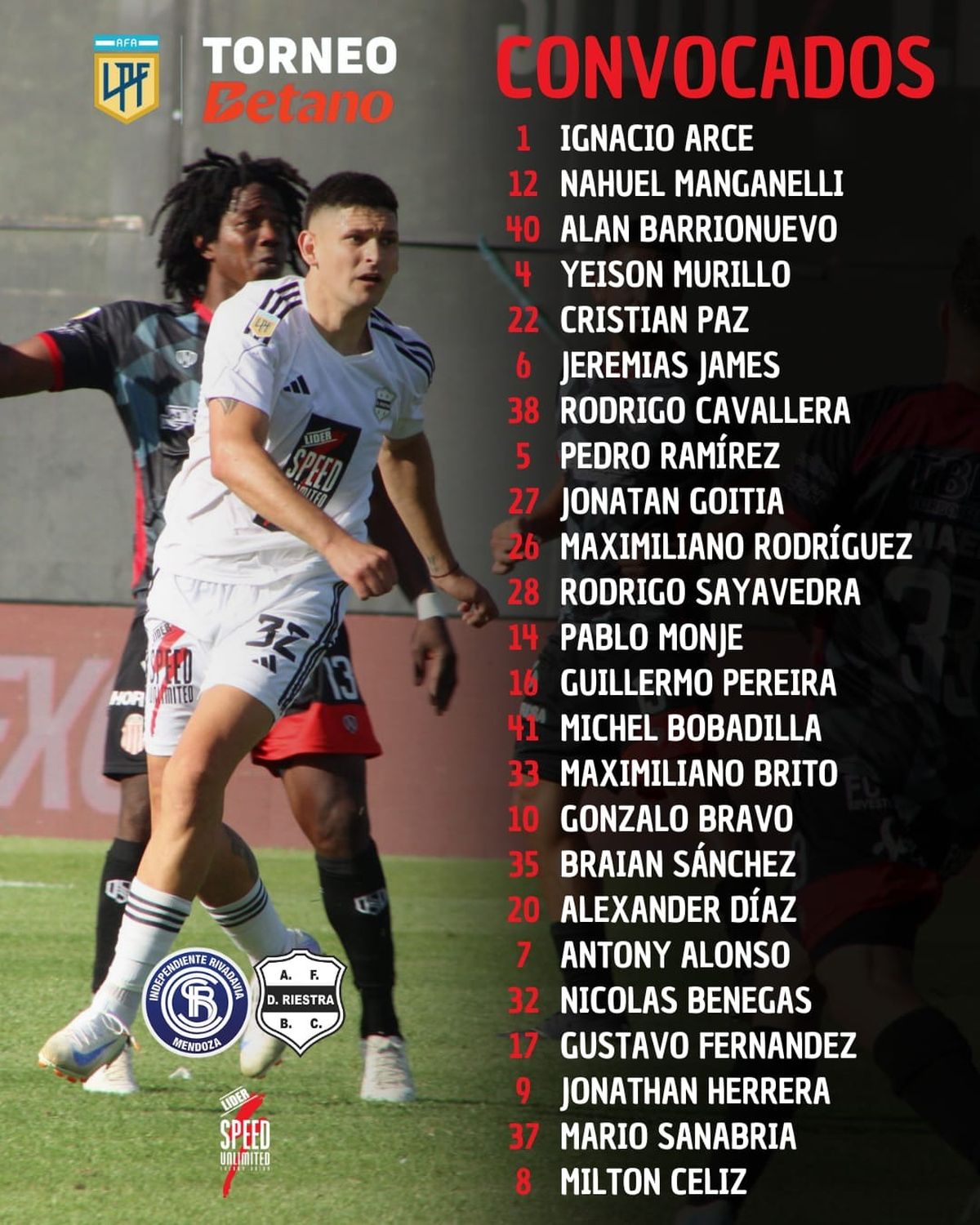 Independiente Rivadavia: Ezequiel Centurión; Luciano Abecasis, Iván Villalba, Sheycko Studer y Tobías Ostchega; Mauricio Cardillo, Franco Romero, Diego Tonetto o Lautaro Ríos y Ezequiel Ham ; Sebastián Villa y Victorio Ramis. DT: Alfredo Berti.