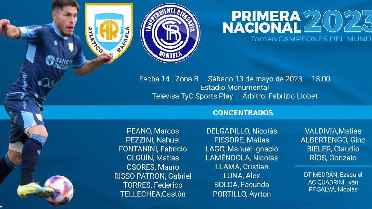 Independiente Rivadavia se presentará este sábado desde las 18 ante Atlético de Rafaela por la 14ta. fecha de la Zona B del torneo de la Primera Nacional.