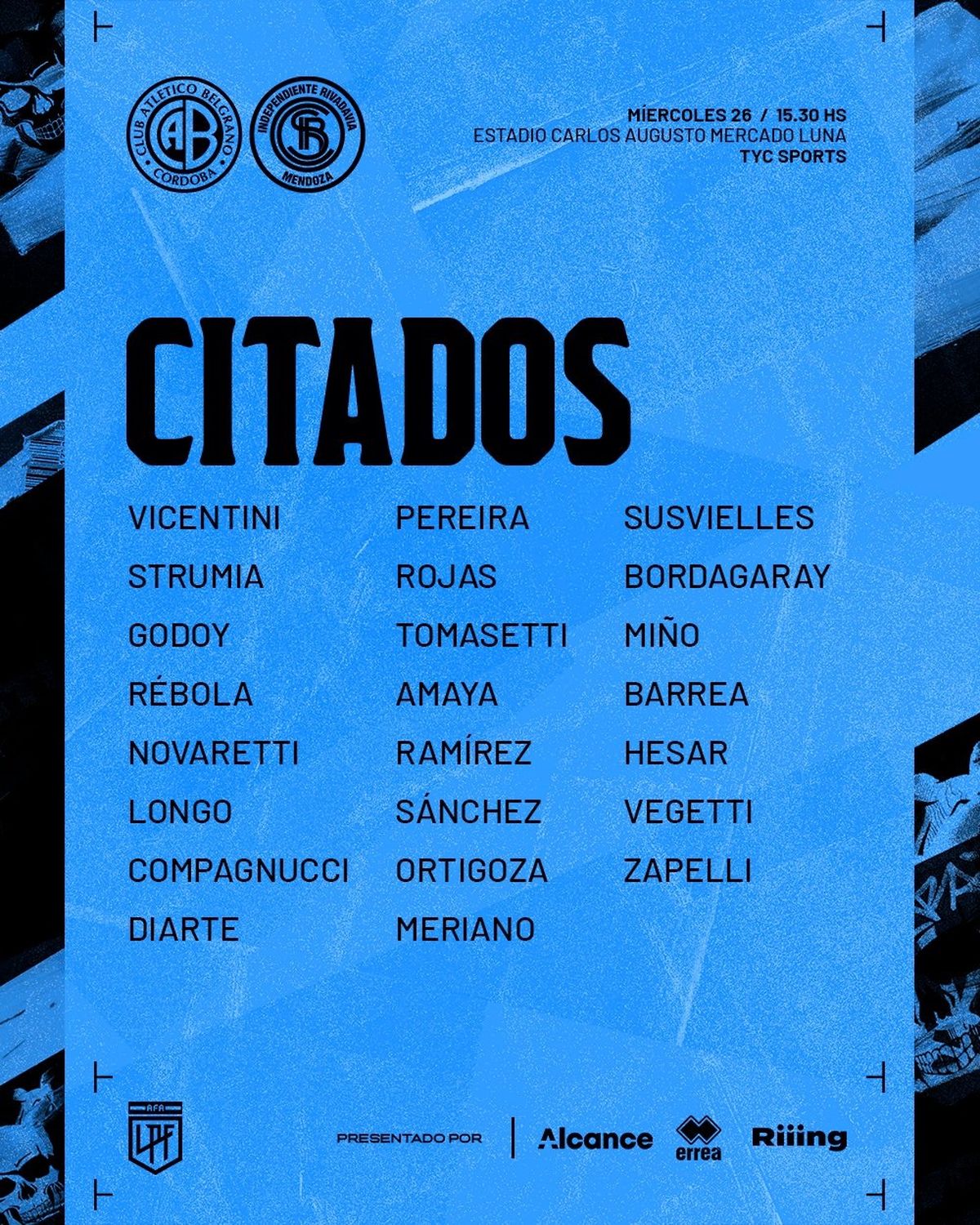 Independiente Rivadavia: Facundo Masuero; Luciano Abecasis, Mauro Maidana, Francisco Petrasso y Juan Manuel Elordi; Franco Romero, Alex Aguado, Luciano Paz y Alex Arce; Victorio Ramis y Jeremias Perales. DT: Guillermo Farré.