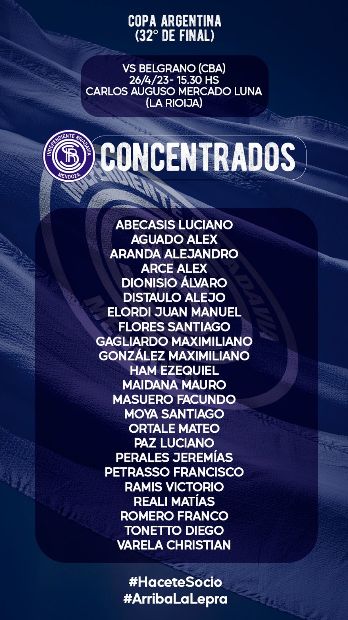 Independiente Rivadavia se enfrentará ante Belgrano de Córdoba, este miércoles desde las 15.30, por los 32avos de final de la Copa Argentina.