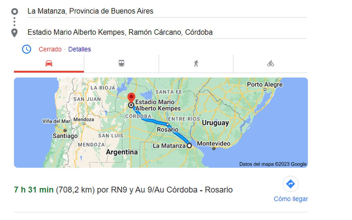 Los simpatizantes de Almirante Brown, por su parte, deberán recorrer 708.2 kilómetros desde La Matanza hasta el Kempes, teniendo que emplear 7 horas y 26 minutos.
