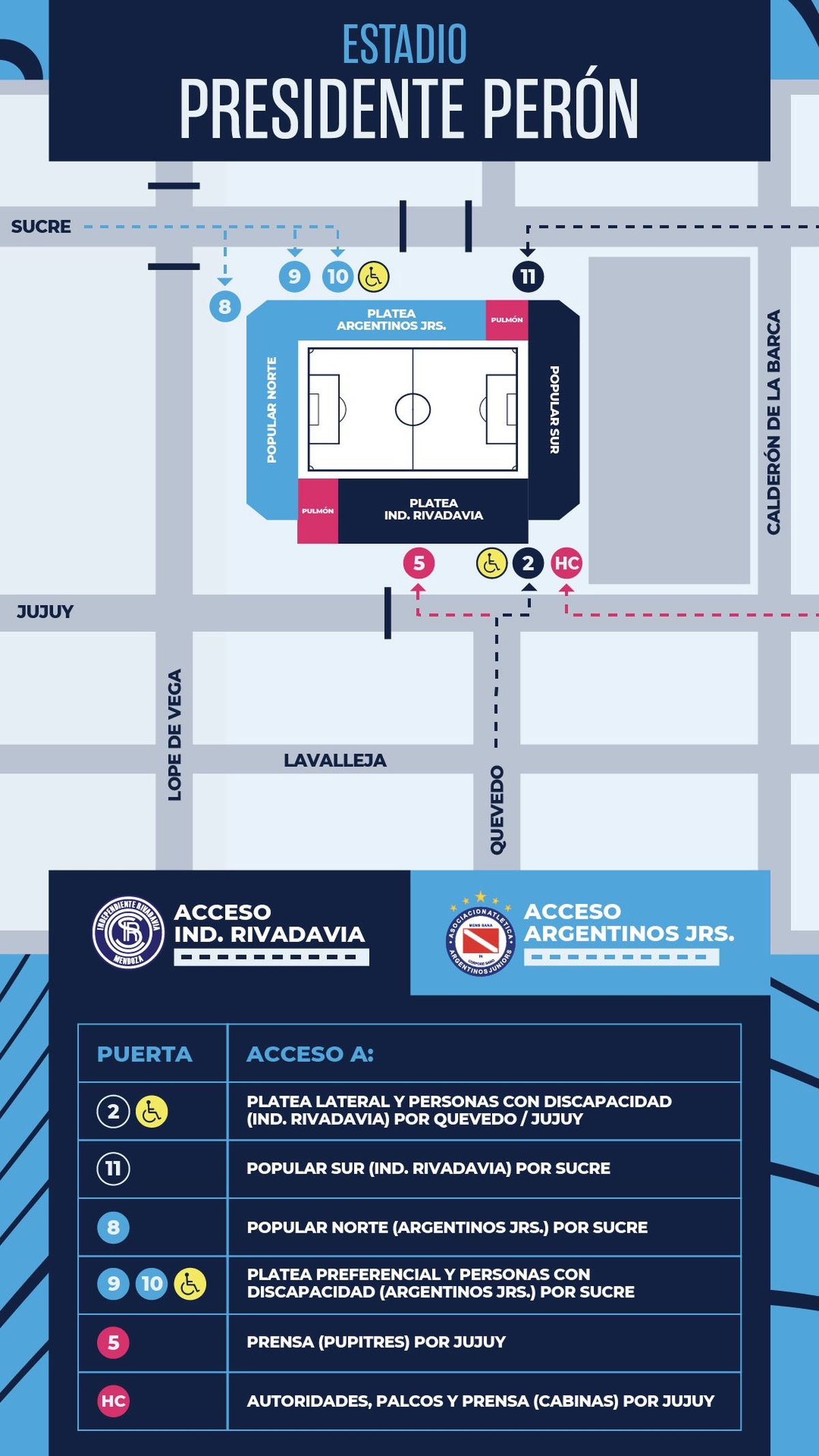 Los hinchas de Independiente Rivadavia se ubicarán en la popular sur Daniel Jiménez y las plateas altas y bajas sobre calle Jujuy (puertas 11 y 2).