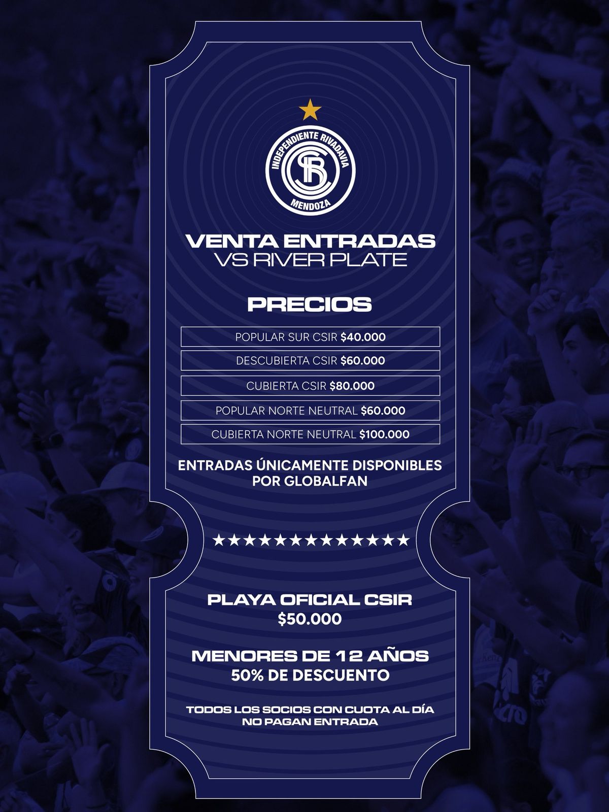 El encuentro será el próximo lunes 2 de marzo a las 21.30 en el estadio Malvinas Argentinas y están a la venta las entradas para los no socios y el público neutral a través de Global Fan. Es importante aclarar que los socios con la cuota de febrero al día no pagan entrada.