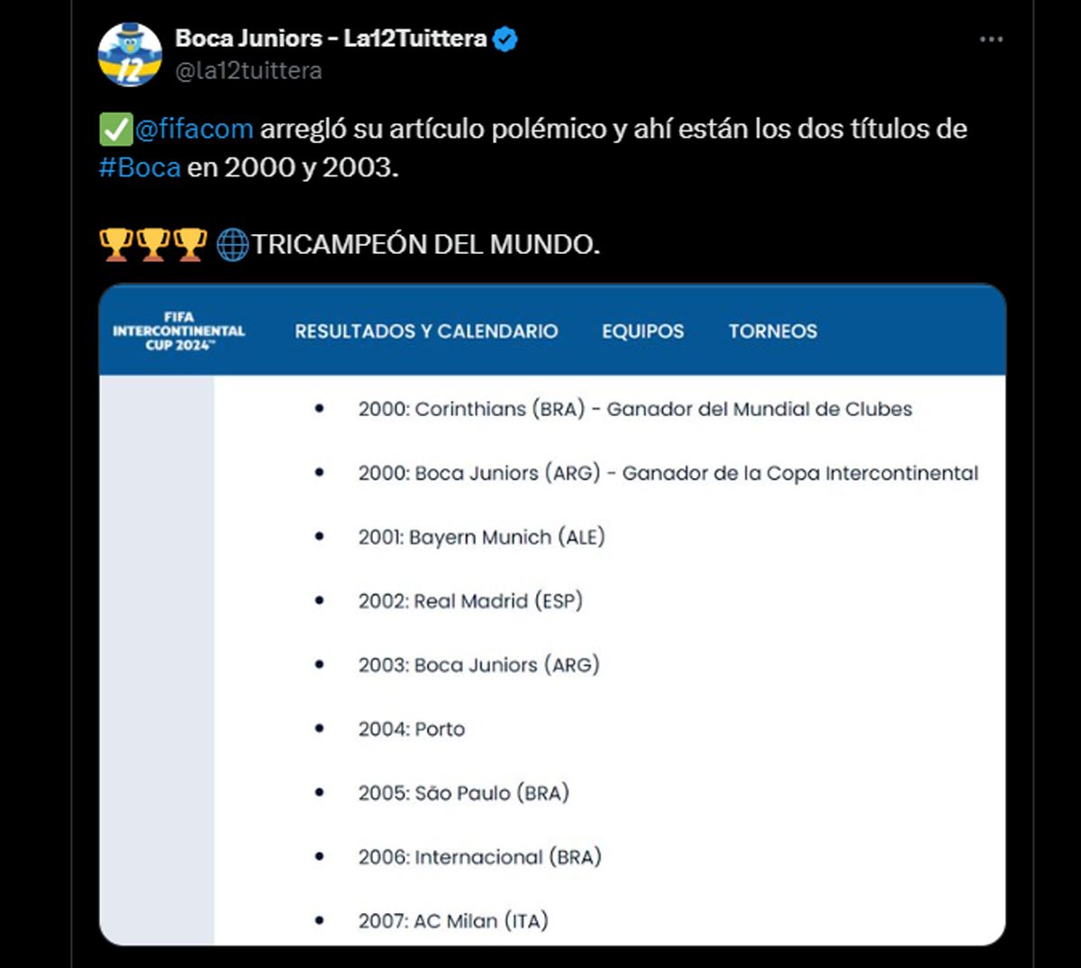 Camino al Mundial de Clubes 2025, la FIFA publicó una lista de campeones del mundo en la que no reconocía como tales los títulos intercontinentales de Boca en 2000 y 2003. Luego la corrigió.