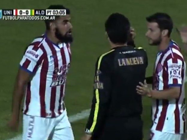 El partido entre Unión y Aldosivi recién empezaba. En menos de 3 minutos del primer tiempo se suscitó la primera polémica y Saúl Laverni quedó en el ojo de la tormenta.Es que el árbitro sancionó un penal inexistente a favor del Tiburón y todos los jugadores del Tatengue se le fueron encima reclamando justicia.