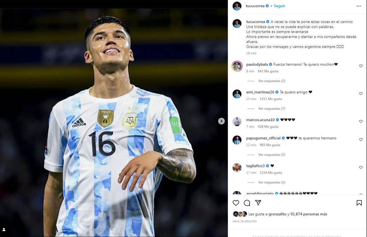 La publicación tuvo comentarios y gestos de apoyo de sus compañeros como Dibu Martínez, quien expresó "Te quiero amigo" o Paulo Dybala, quien señaló: "Fuerza hermano. Te quiero mucho".