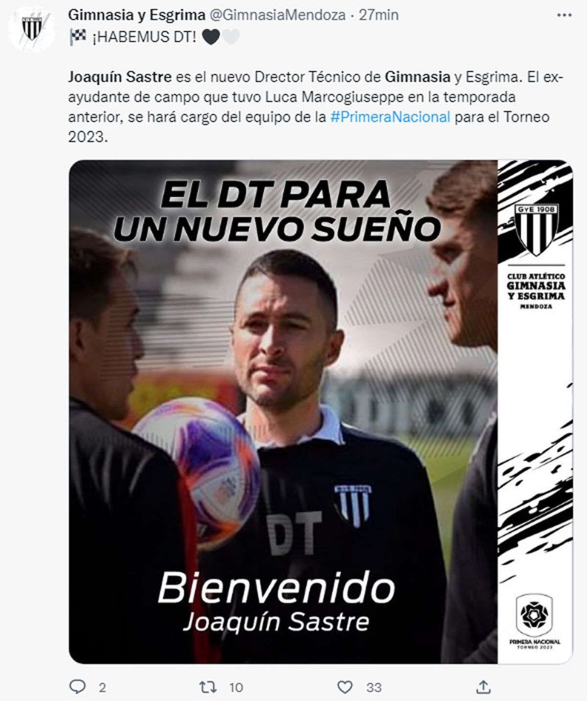 Gimnasia y Esgrima tiene nuevo técnico. Se trata de Joaquín Sastre, quien fue el ayudante de campo de Luca Marcogiuseppe en el Lobo en la temporada pasada. El nuevo DT mensana dirigirá al equipo en la Primera Nacional en el 2023.