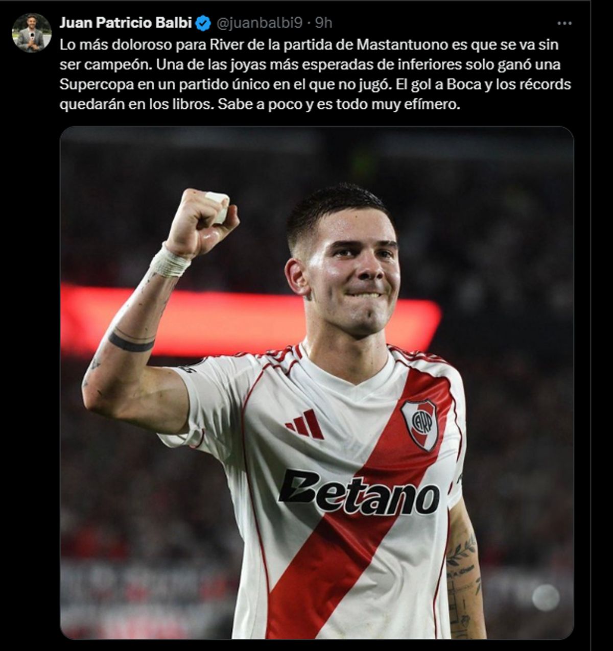 El mandatario del Millonario mencionó también que considera a Mastantuono “una de las apariciones más importantes de los últimos 20 o 30 años en Argentina”.