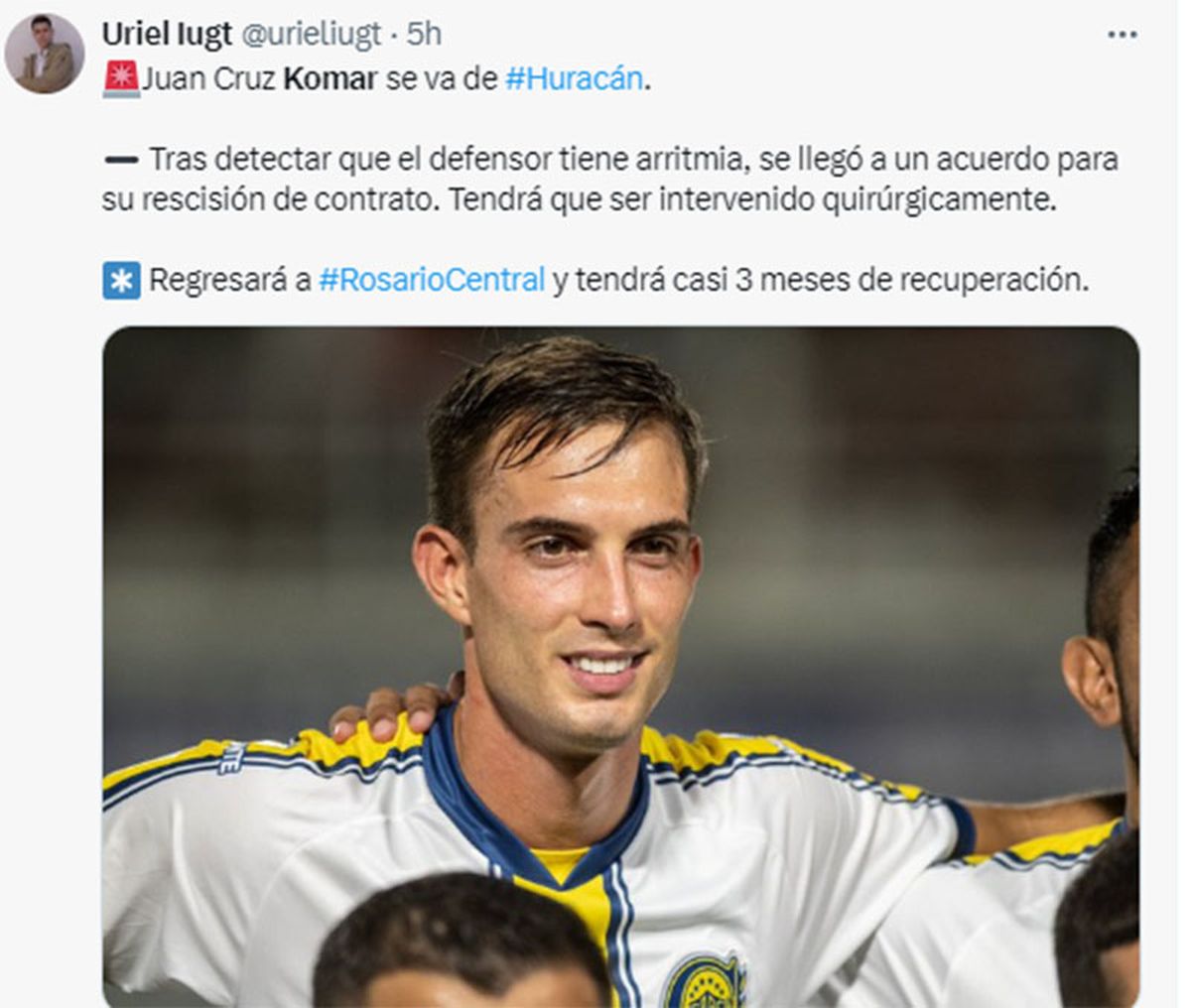 El defensor Juan Cruz Komar, quien fue jugador de Boca, la pasa mal. Durante la revisión médica en Huracán de Parque de los Patricios (el pasado 23 de julio fue anunciado como nuevo refuerzo), le detectaron una arritmia cardíaca que lo obligó a rescindir contrato con ese club y deberá volver a Rosario Central.