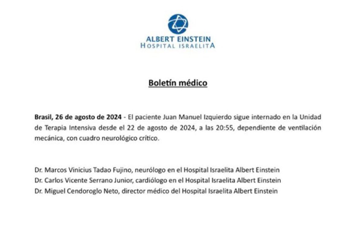 El futbolista uruguayo Juan Izquierdo permanece internado en San Pablo dependiendo de ventilación mecánica y con un cuadro neurológico crítico, según el último parte médico.