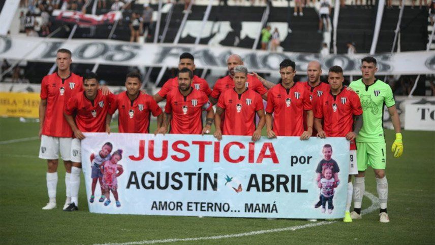 Los jugadores de Gimnasia y Esgrima, en la previa del partido que disputaron ante Almagro, en el Legrotaglie, salieron a la cancha con una bandera con la frase "Justicia por Agustín y Abril".