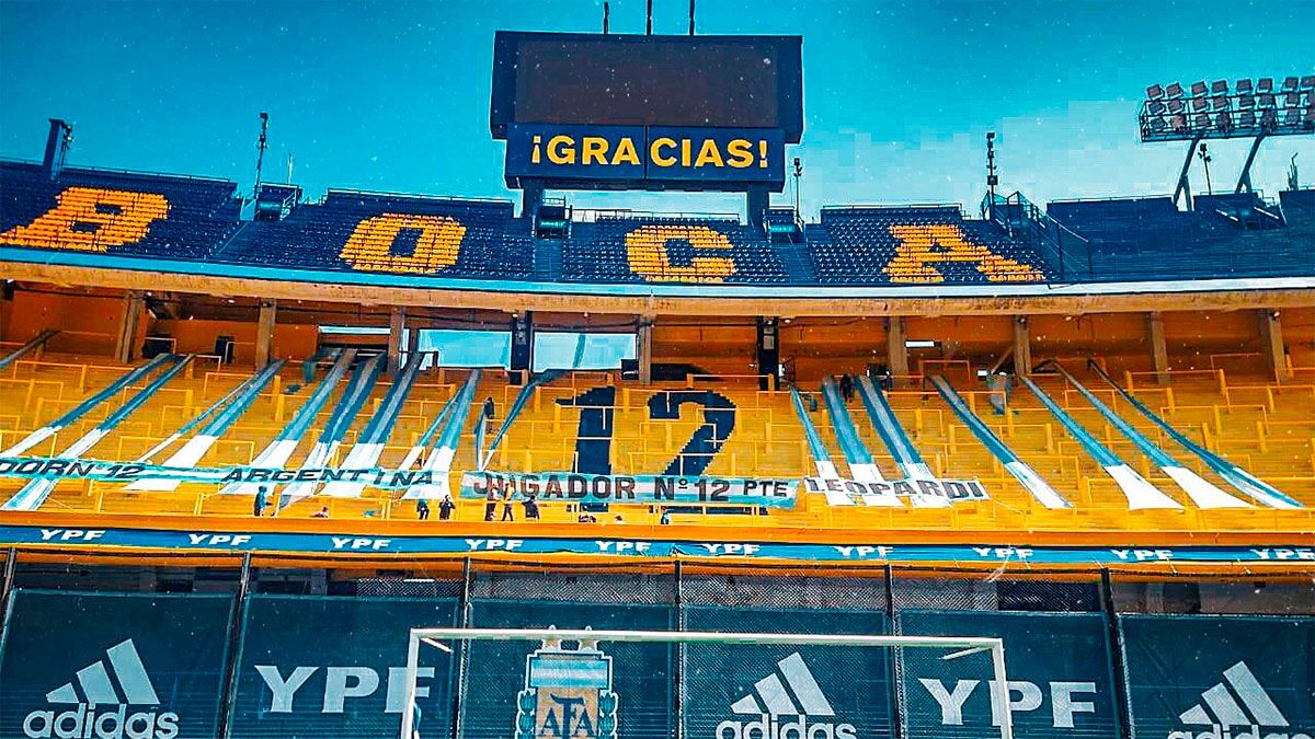En tanto que en el sector donde se ubica La 12, en la segunda bandeja que da a Casa Amarilla, se ven los tirantes que utilizan la mayoría de las hinchadas, pero con el color celeste y blanco. Además está el trapo que dice "Jugador N° 12".