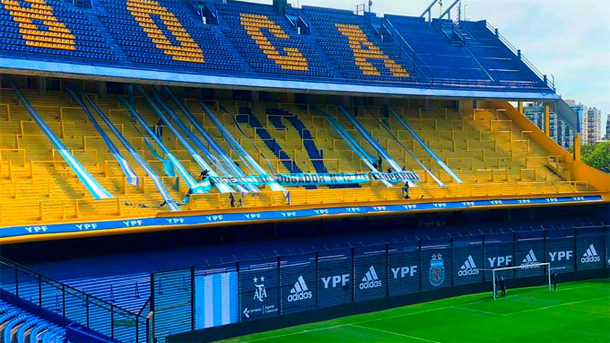 Otro de los telones que se visualizan en La Bombonera está colgado en los palcos, en la zona superior a los bancos de suplentes, que reza “El templo del fútbol mundial te alienta”.