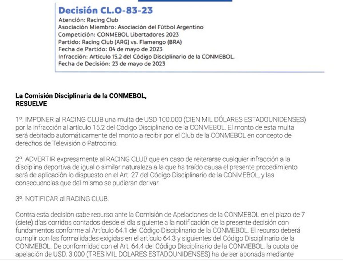 Racing recibió este miércoles una multa de 100.000 dólares por parte de la Conmebol por cantos racistas contra Flamengo, en un partido correspondiente a la Copa Libertadores de América.