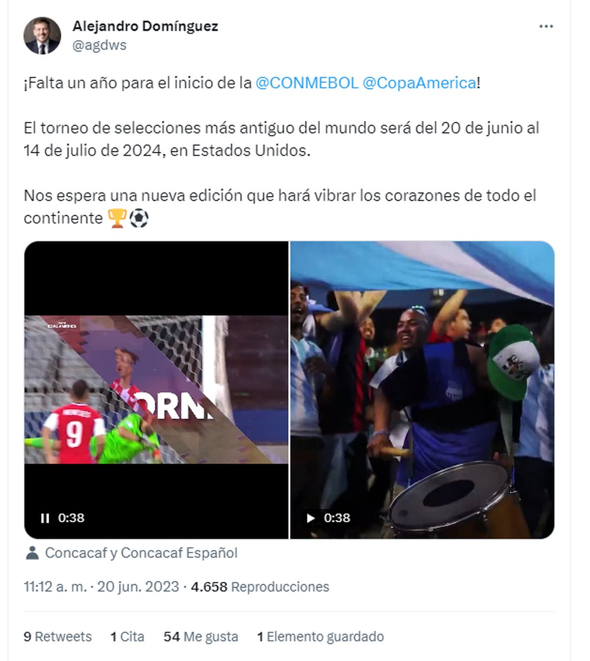 "El torneo de selecciones más antiguo del mundo se jugará desde el 20 de junio al 14 de julio de 2024, en Estados Unidos", confirmó Alejandro Domínguez en su cuenta oficial de Twitter.