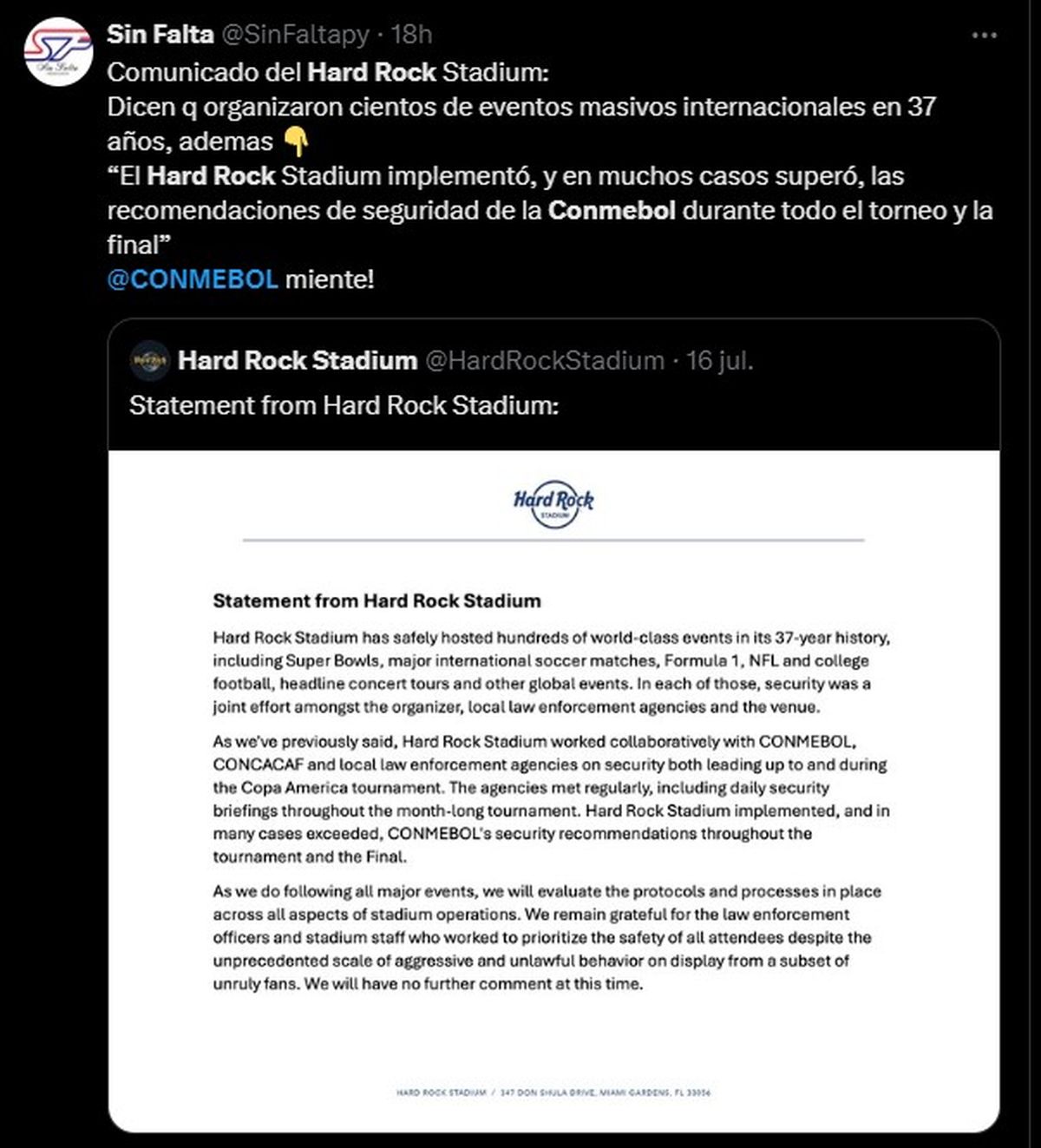 El Hard Rock Stadium defendió su protocolo de seguridad, señalando que trabajaron en colaboración con Conmebol, Concacaf y las agencias policiales locales. "La seguridad es un esfuerzo conjunto entre el organizador, las autoridades locales y el lugar de celebración de cada evento", afirmaron.
