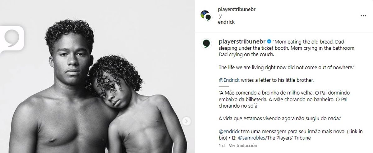 Además reveló la promesa de libertad que anhela en la elección de vida del pequeño. "En realidad tengo otro objetivo, ese objetivo es que tú puedas vivir la vida que quieras, sea la que sea. Durante tres generaciones nuestra familia ha perseguido el sueño del fútbol. Pero ahora tú puedes hacer lo que quieras. Puedes ser médico, abogado. Ya persigues la pelota, igual que yo. Así que puedes ser futbolista si quieres. Pero no tienes que serlo. Ya no hay más presión, gracias a Dios, gracias a mamá y a papá, y gracias al fútbol. Dedícate a disfrutar tu vida como quieras, hermano. Este es mi regalo para ti. Te quiero, hermano. Desde el fondo de mi corazón, Endrick Felipe Moreira de Sousa, DELANTERO”.
