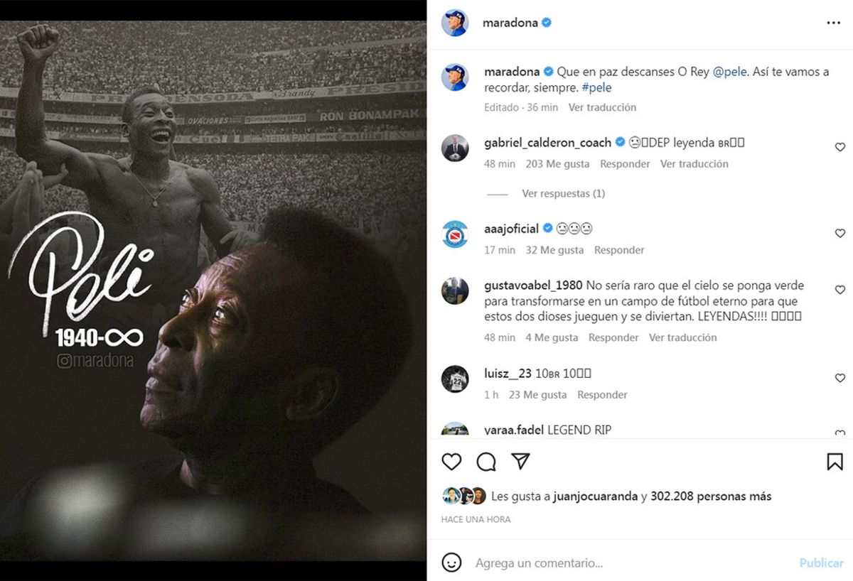 La familia de Diego Maradona homenajeó a la leyenda brasileña Pelé, fallecido este jueves en la ciudad de San Pablo, con un mensaje en la cuenta oficial del astro argentino en Instagram.