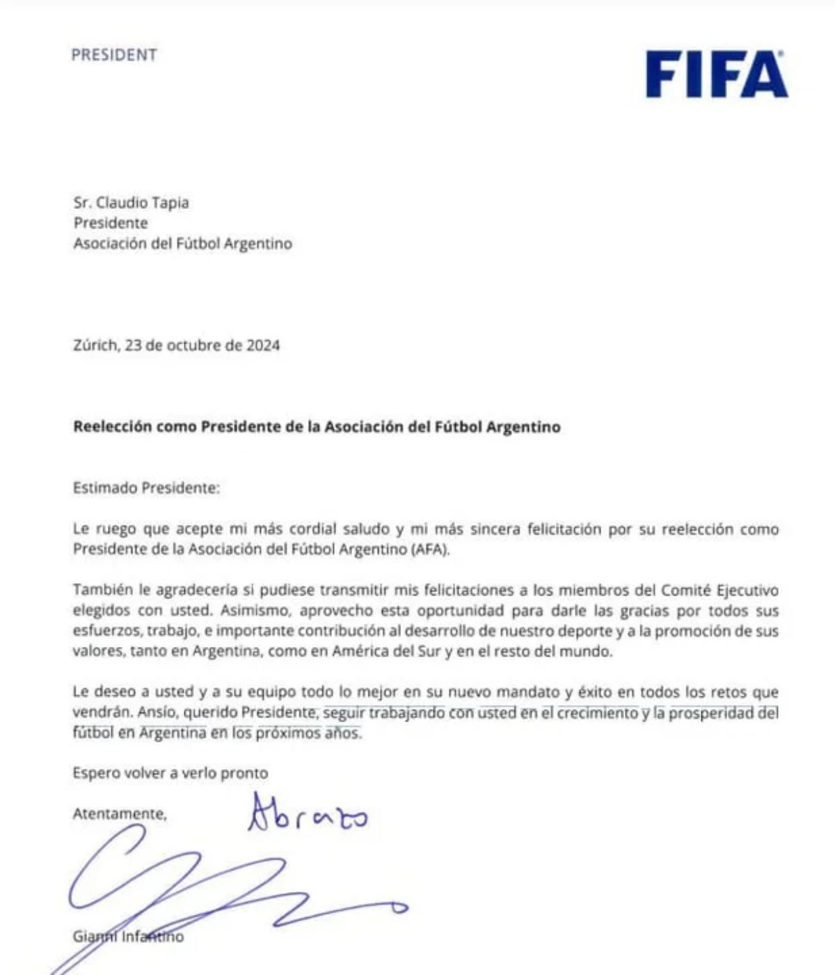 Además del pertinente saludo de Infantino, el presidente de FIFA le agradeció "todos sus esfuerzos trabajo, e importante contribución al desarrollo de nuestro deporte y a la promoción de sus valores, tanto en Argentina, como en América del Sur y en el resto del mundo".