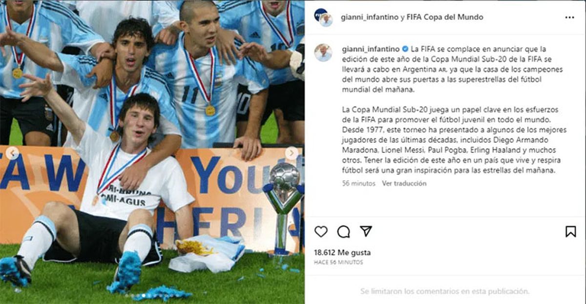 "El Bureau del Consejo de la FIFA ha confirmado a Argentina como sede de la Copa Mundial Sub-20 de la FIFA. La decisión sigue a la destitución del anfitrión original del torneo, Indonesia, así como a una oferta posterior presentada por la Asociación Argentina de Fútbol (AFA) y una inspección in situ realizada por una delegación de la FIFA en el país sudamericano la semana pasada", se indicó.