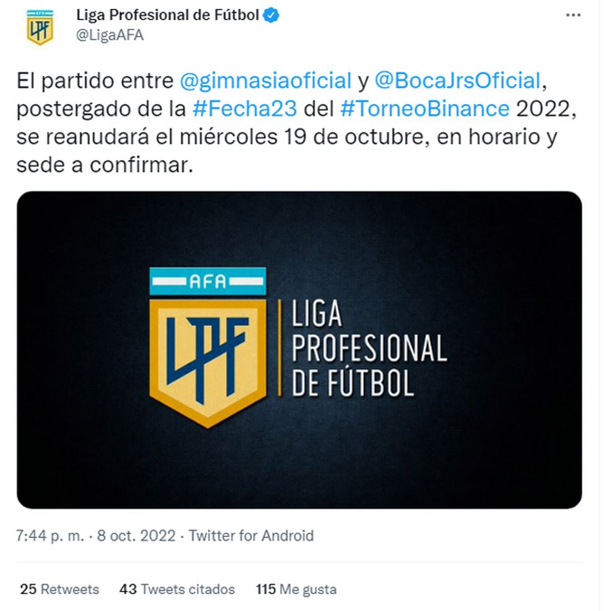 "El partido entre Gimnasia y Esgrima La Plata y Boca Juniors, postergado de la Fecha 23 del la Liga Profesional 2022, se reanudará el miércoles 19 de octubre, en horario y sede a confirmar", publicaron desde el ente madre drl fútbol argentino.