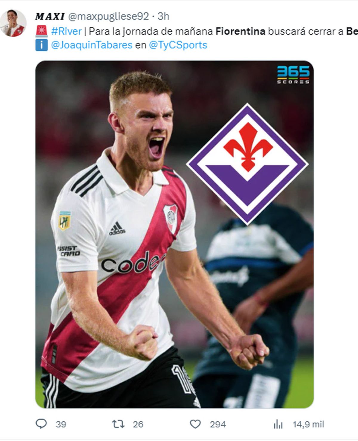 Lucas Beltrán, el goleador de la Era Demichelis, podría irse a la Fiorentina de Italia, que prepara una oferta de 23 millones de euros para incorporarlo a sus filas.
