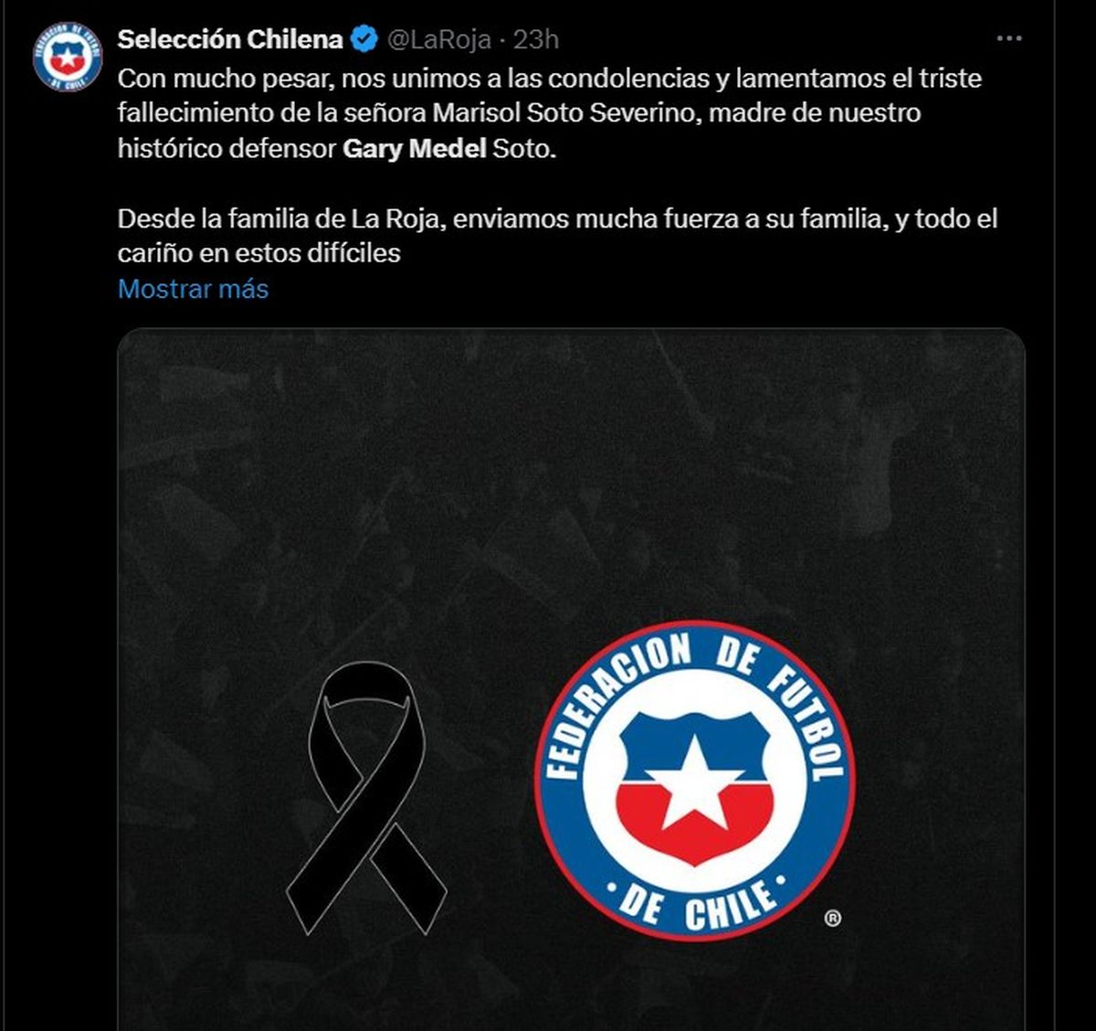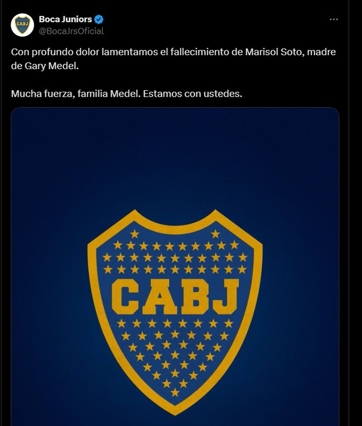 "Con profundo dolor lamentamos el fallecimiento de Marisol Soto, madre de Gary Medel. Mucha fuerza, familia Medel. Estamos con ustedes", indicaron las redes sociales xeneizes para saludar al chileno.