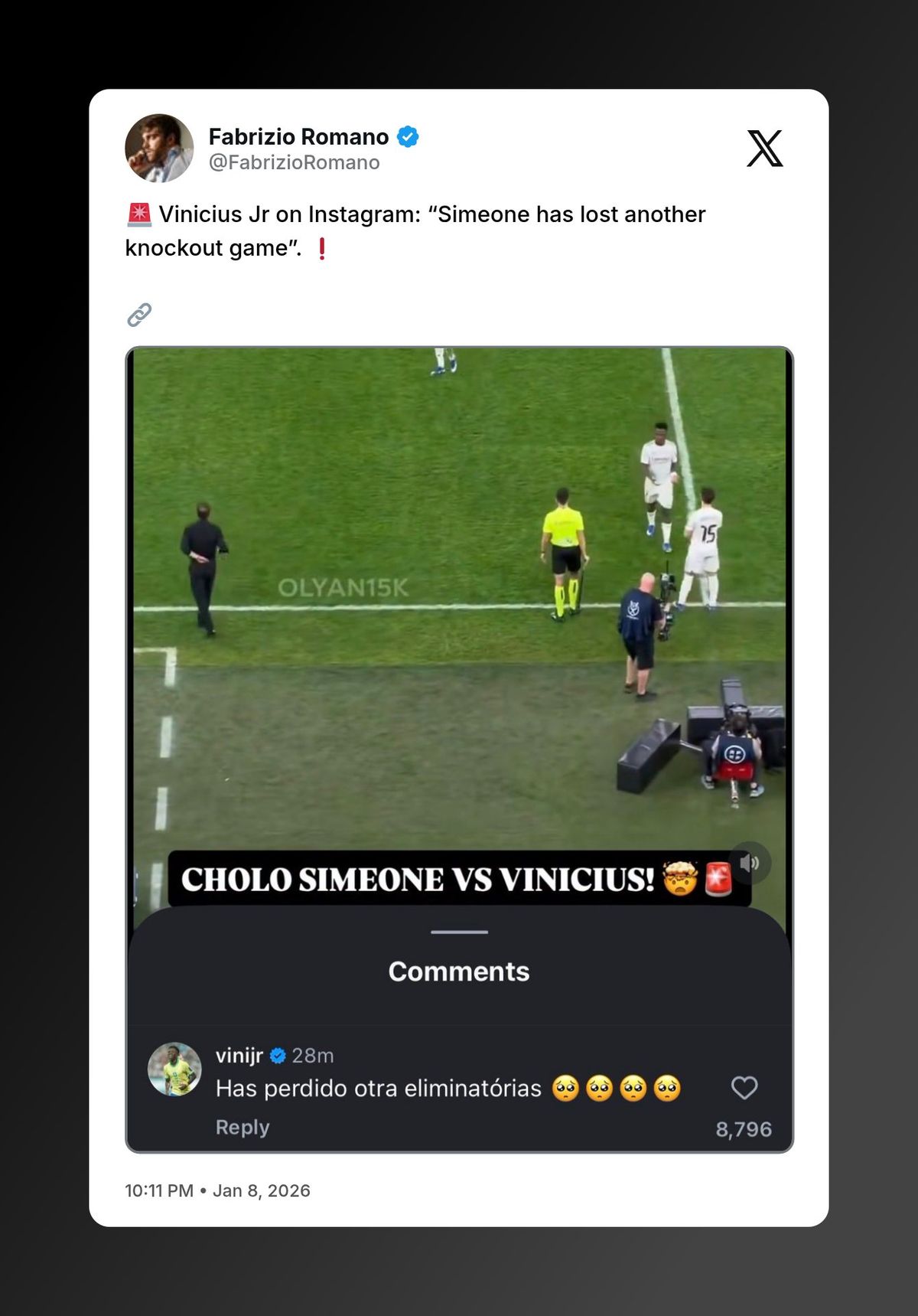 "Son dos sudamericanos que viven el fútbol de una manera muy loca. Como capitán del equipo, a Vini siempre lo voy a defender. Es un jugador muy especial en el club, nos ha dado millones de alegría. Siempre voy a estar con él", cerró el uruguayo.