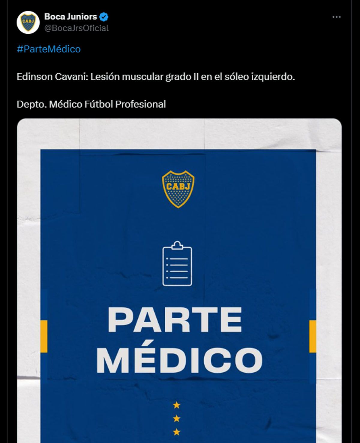 Edinson Cavani se lesionó este miércoles en la práctica de Boca y quedó descartado para el encuentro de vuelta ante Cruzeiro, en Brasil, por los octavos de final de la Copa Sudamericana 2024.