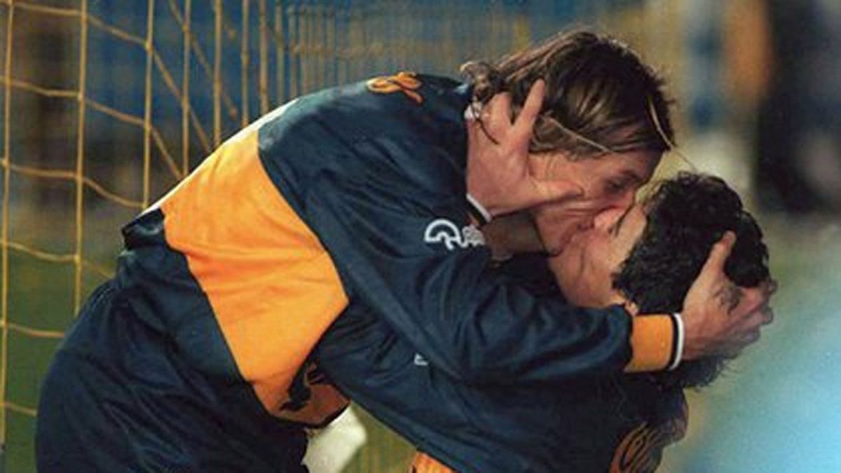 Cani y Maradona se reencontraron al final de sus carreras en Boca, donde demostraron el amor que los unía con un "piquito" en el festejo de un gol.