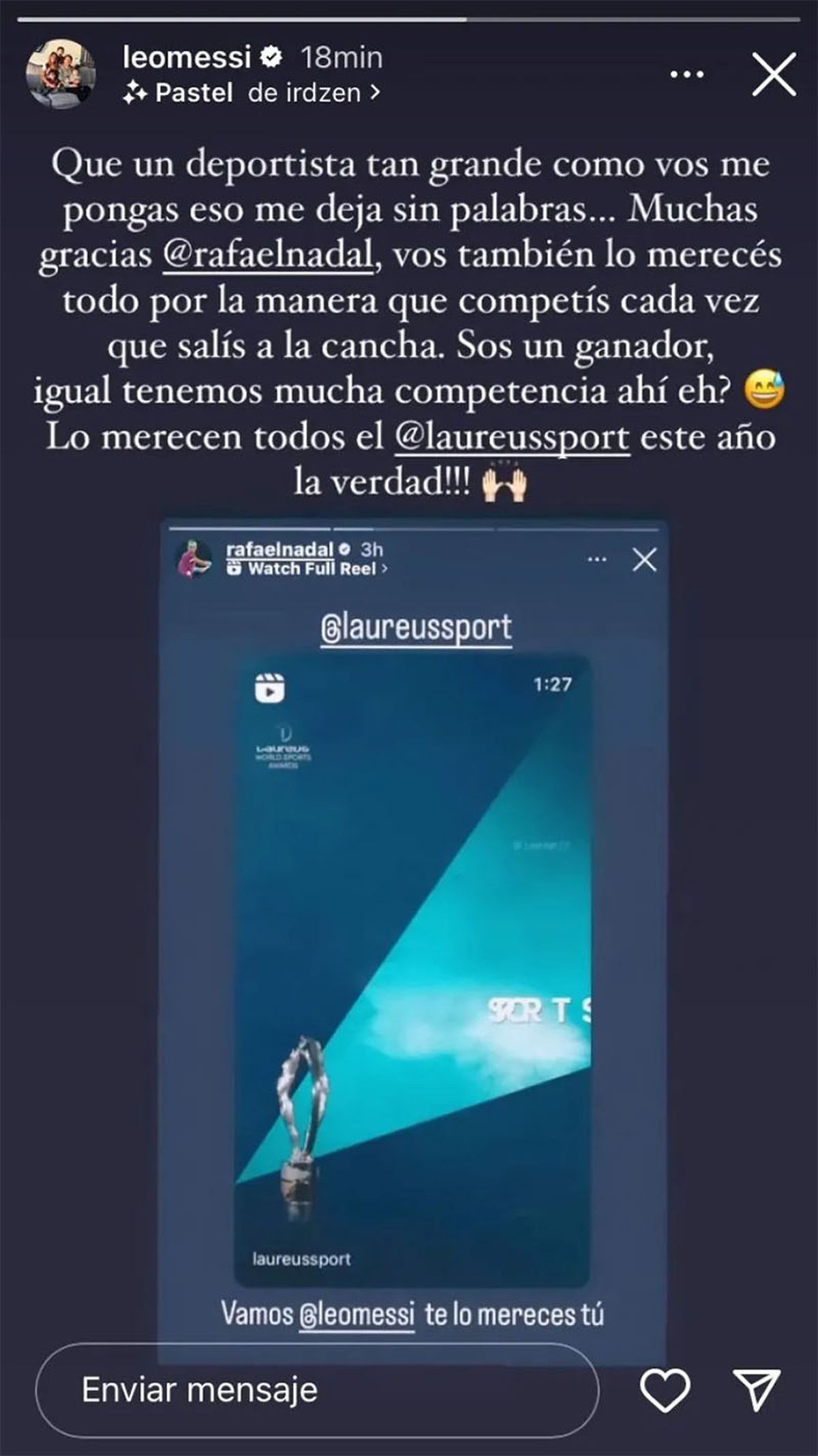 "Muchas gracias @rafaelnadal, vos también lo merecés todo por la manera que competís cada vez que salís a la cancha. Sos un ganador, igual tenemos mucha competencia ahí, eh. Lo merecen todos el @laureyssport este año la verdad", escribió "la Pulga".