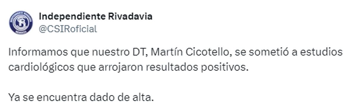 Independiente Rivadavia emitió un nuevo parte médico respecto de la salud del DT Martín Cicotello, quien fue internado este miércoles en unidad coronaria.