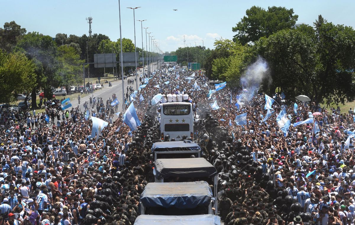 La Selección Argentina realizó este martes gran parte del recorrido por el festejo de la obtención del Mundial Qatar 2022, en un micro descapotable, pero por el colapso que produjo la cantidad de personas, la caravana se terminó antes de lo previsto. Se cambió de recorrido, los jugadores se fueron en cinco helicópteros rumbo al predio de Ezeiza y luego abandonaron las instalaciones de la AFA.