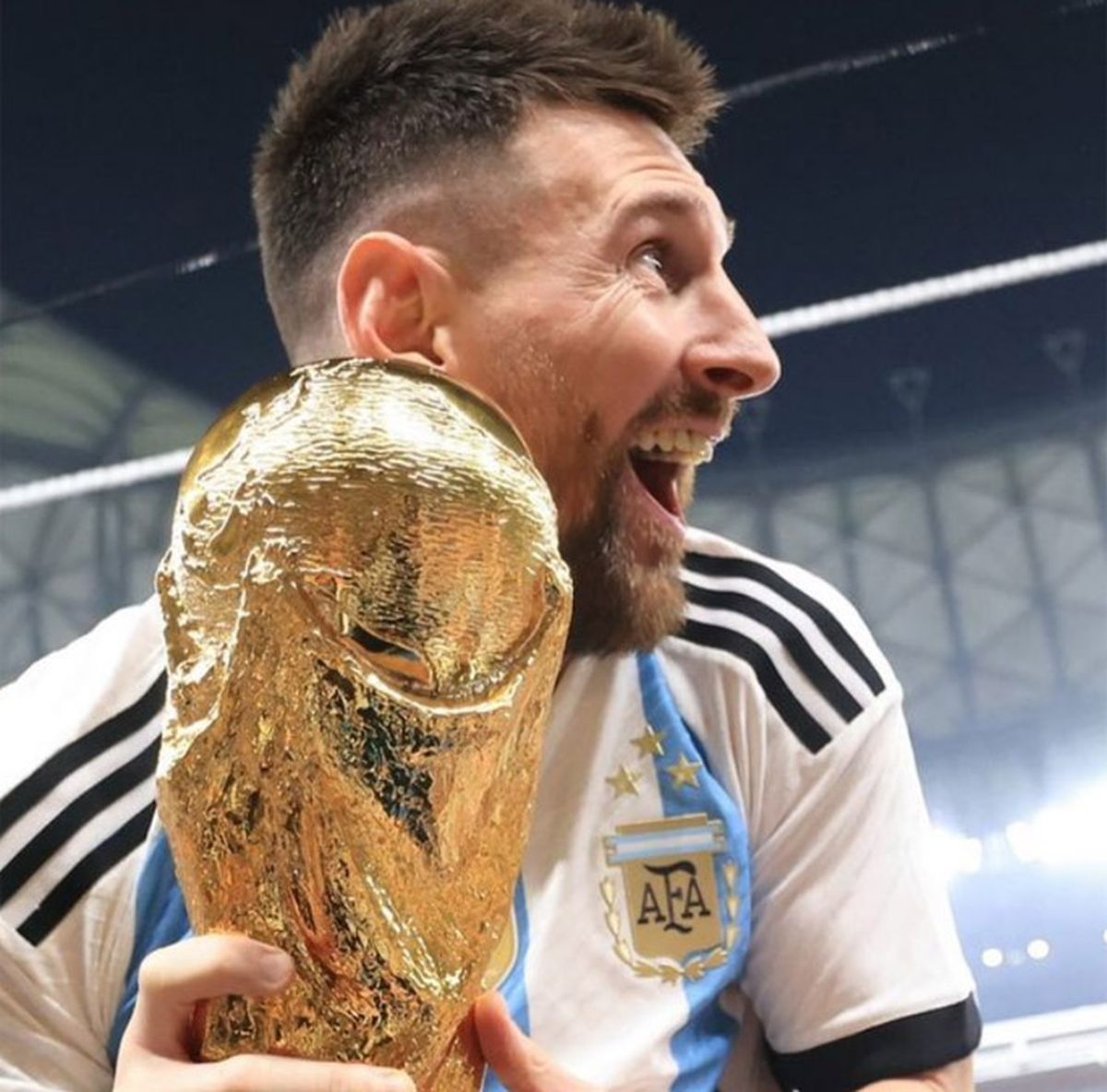 Desde el mismo avión, el capitán de la Selección, Lionel Messi, posteó en su cuenta oficial de Instagram una foto en donde exhibe la Copa del Mundo ganada el lines por la Selección argentina en la final frente a Francia.