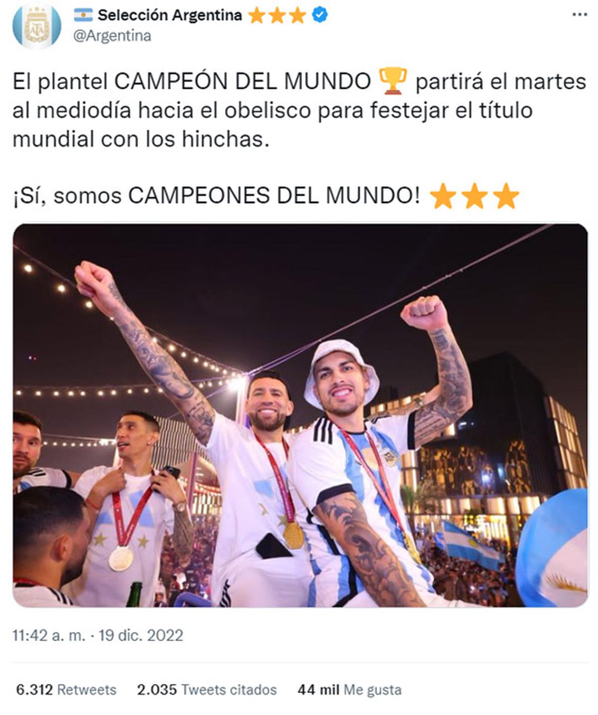 "El plantel campeón del mundo partirá el martes al mediodía hacia el Obelisco para festejar el título mundial con los hinchas. ¡Sí, somos campeones del mundo!", afirmó el posteo de la Selección argentina.