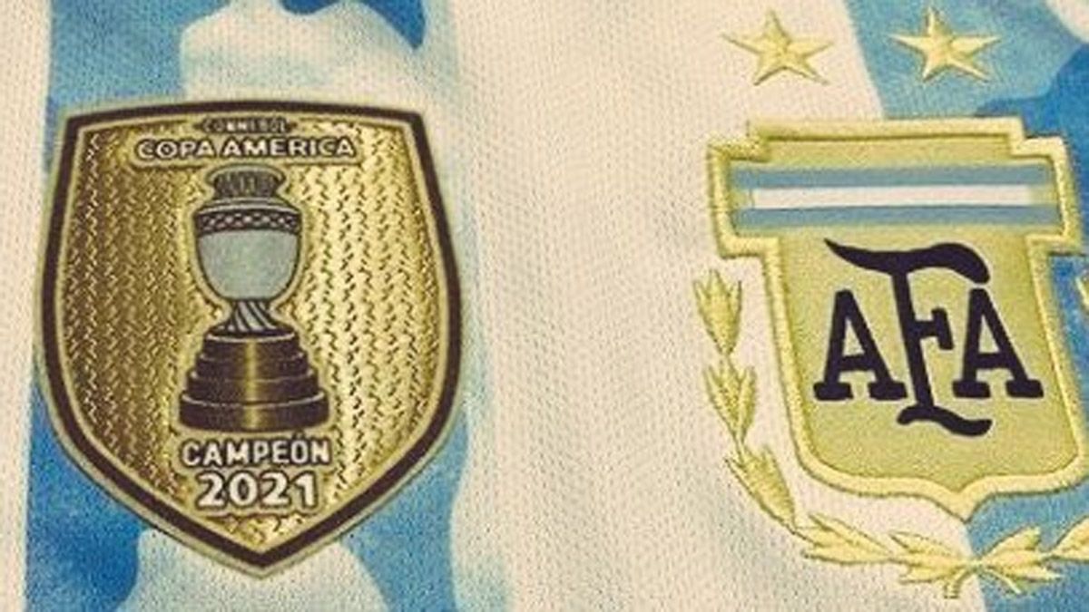 Tras haberse consagrado campeón de la Copa América 2021, la camiseta albiceleste mostrará un escudo dorado con la Copa América silueteada y la frase “Campeón 2021” estampada en la parte inferior.