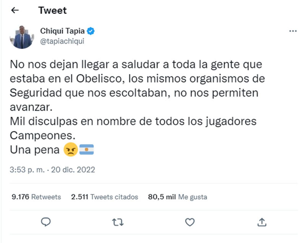 El presidente de la Asociación del Fútbol Argentino (AFA), Claudio Chiqui Tapia, pidió "mil disculpas" a los fanáticos que se acercaron a la multitudinaria e histórica caravana de la Selección argentina para celebrar la conquista del Mundial Qatar 2022 y advirtió que no pudieron "avanzar" hasta El Obelisco.