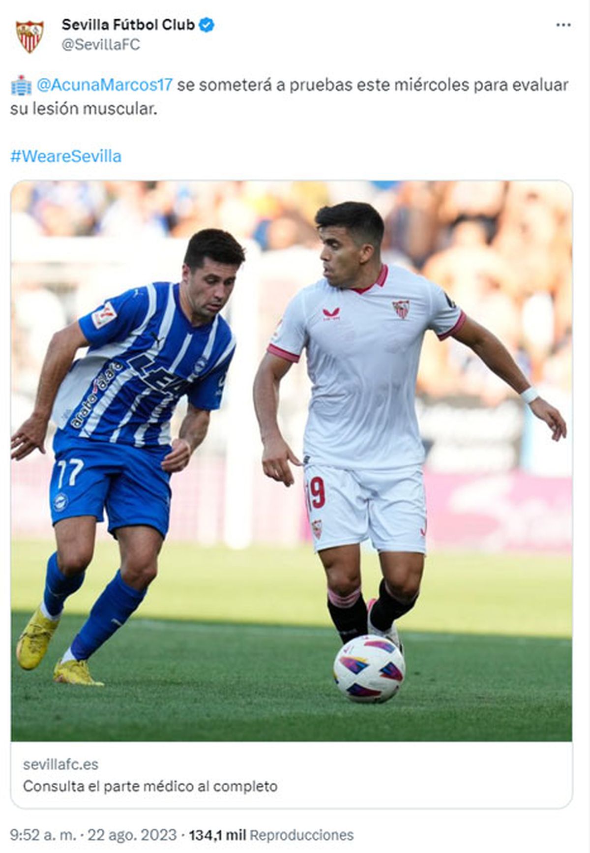 El Huevo Acuña fue titular el lunes en la derrota de Sevilla ante Alavés por LaLiga española, pero fue reemplazado en el entretiempo.