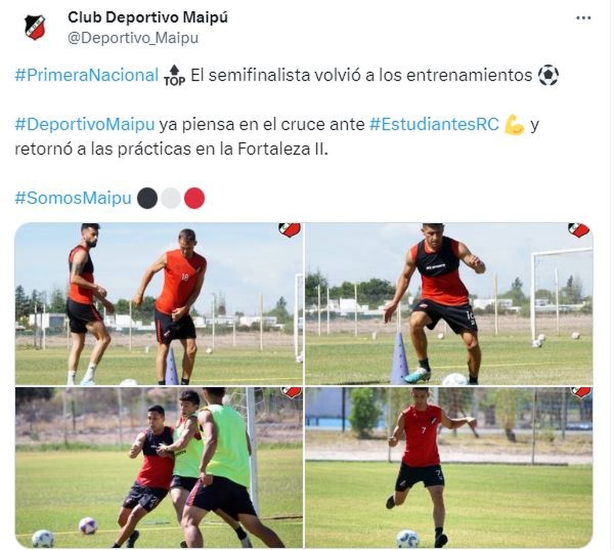 El plantel del Deportivo Maipú volvió a entrenar este miércoles en su predio, de cara al partido de ida por la semifinal por el segundo ascenso que protagonizará de visitante ante Estudiantes de Río Cuarto.