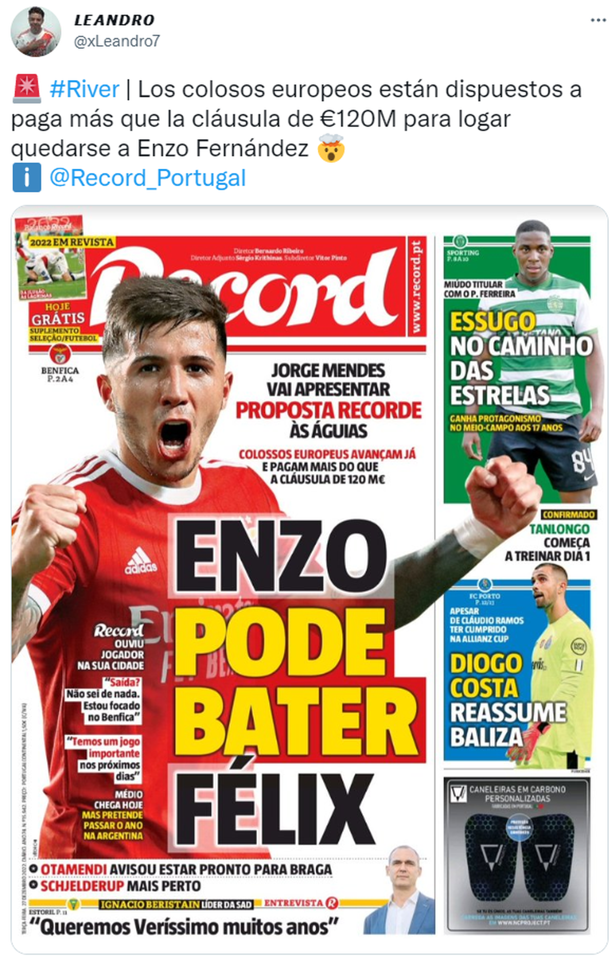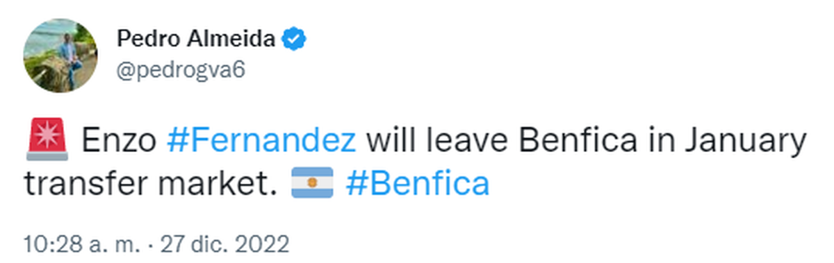 Según A Bola, el principal diario deportivo de Portugal, el Newcastle inglés realizó una "sorprendente oferta" al Benfica por Fernández, jugador revelación del Mundial Qatar 2022, pero no habría sido suficiente para saciar las pretensiones del club. El periodista portugués, especialista en transferencias, Pedro Almeida, aseguró que Enzo sería vendido en enero, a pesar de que el jugador declaró hace algunas horas "no saber de intereses" y que "solo está centrado en el partido que viene".