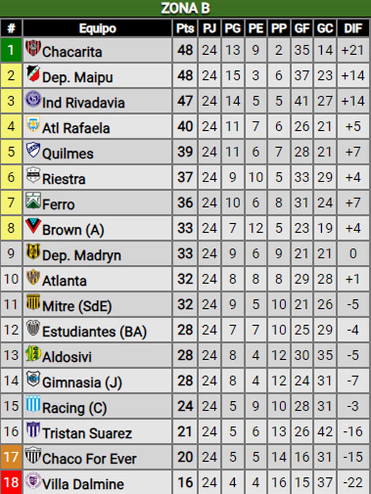 El sábado, el Deportivo Maipú perdió 1-0 en su visita a Riestra y quedó también con 48 unidades, aunque con peor diferencia de gol respecto a Chacarita.